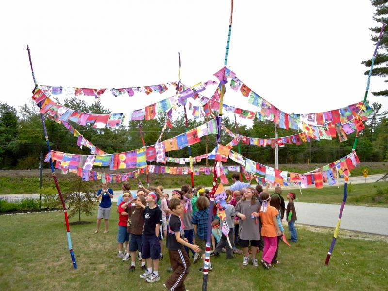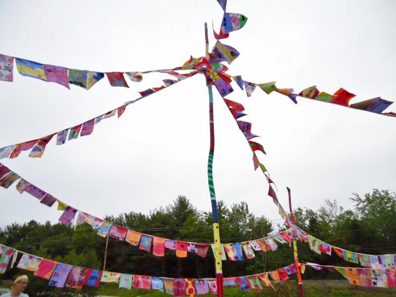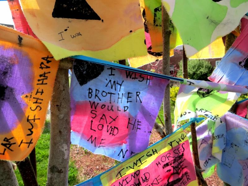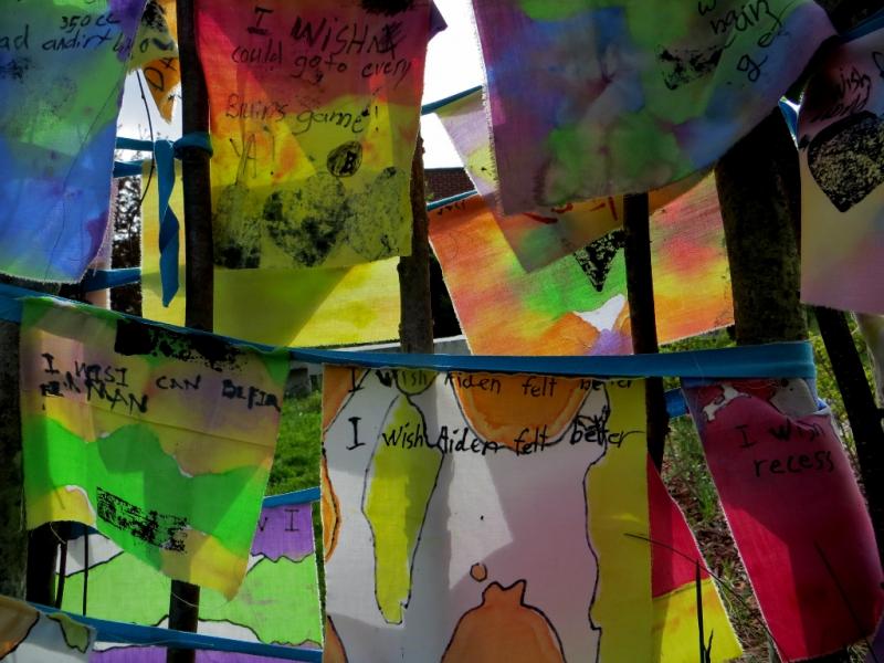 These installations are based loosely on a Himalayan tradition of prayer flags. We dye cloth and make beautiful flags, embellish them with handmade wooden stamps and invite the community to write their most important wishes on them. The project has an accompanying story about hope, wind horses, and believing in impossible things. The final product is a space filled with color, life, hope, and possibility. Inspirational. The process is delightful and magical and transformational turning simple materials into conveyors of our hopes and dreams.