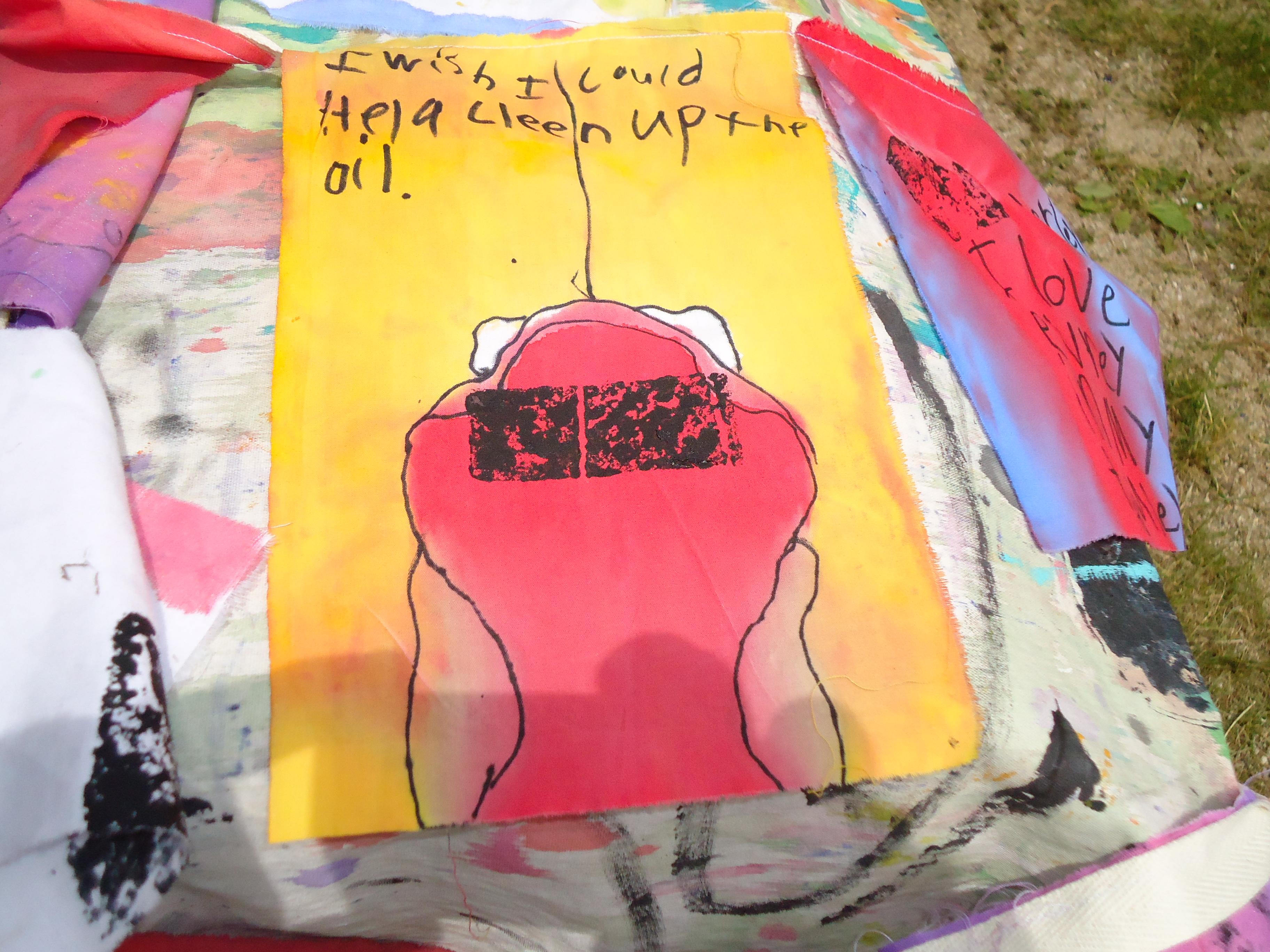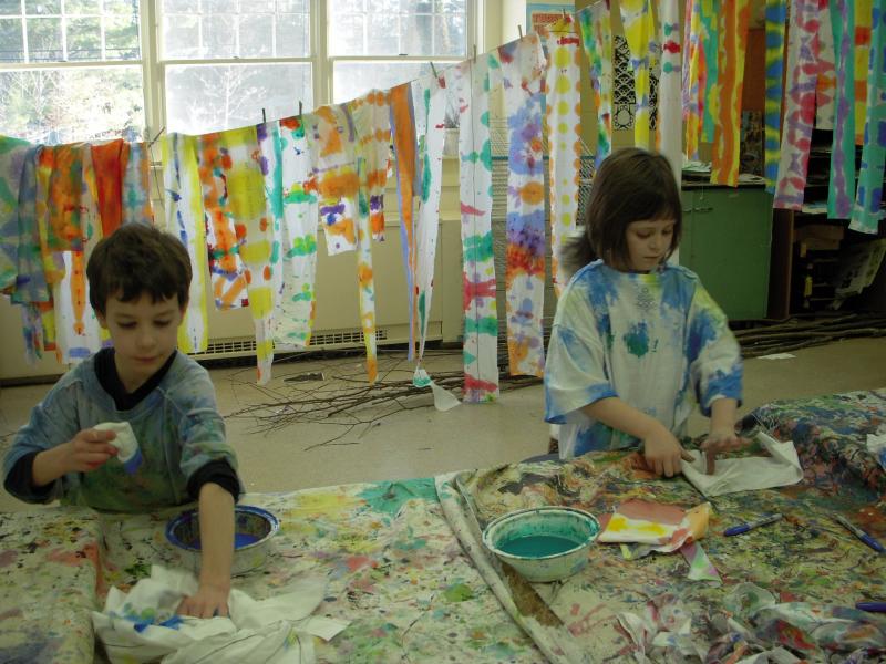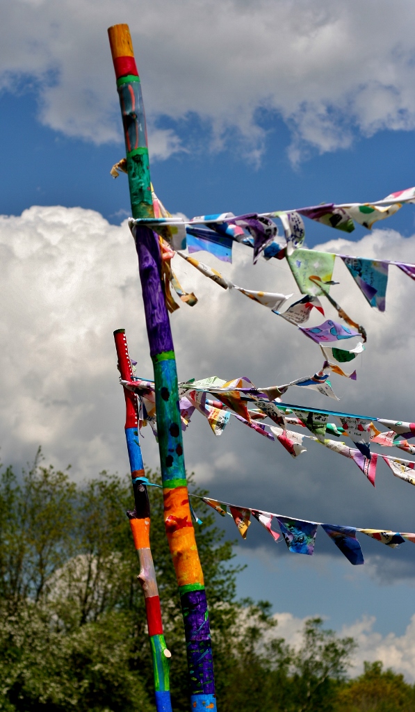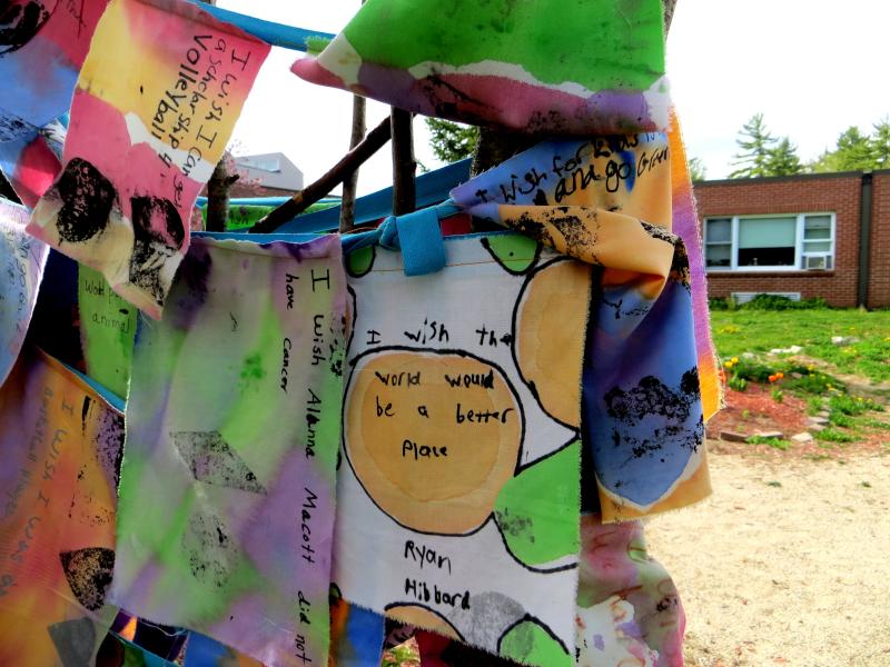These installations are based loosely on a Himalayan tradition of prayer flags. We dye cloth and make beautiful flags, embellish them with handmade wooden stamps and invite the community to write their most important wishes on them. The project has an accompanying story about hope, wind horses, and believing in impossible things. The final product is a space filled with color, life, hope, and possibility. Inspirational. The process is delightful and magical and transformational turning simple materials into conveyors of our hopes and dreams.